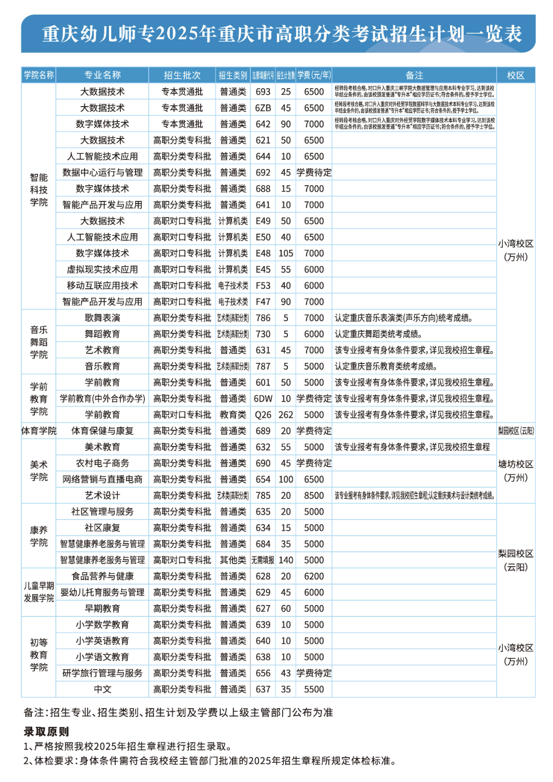 三、学费 学费: 2025年全日制普通专业学费标准为5000元至8500元/学年,具体因专业而异。 5000元/学年:学前教育、早期教育、小学语文教育、小学数学教育、美术教育等师范类专业。 5500-6500元/学年:社会体育、中文、人工智能技术应用、大数据技术等非师范专业。 7000-8500元/学年:数字媒体技术、艺术教育、智能产品开发等实践性较强的专业。 住宿费: 四人间:1200元/年 四、25年春招招生计划