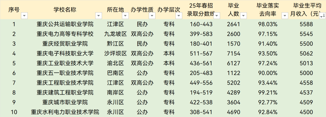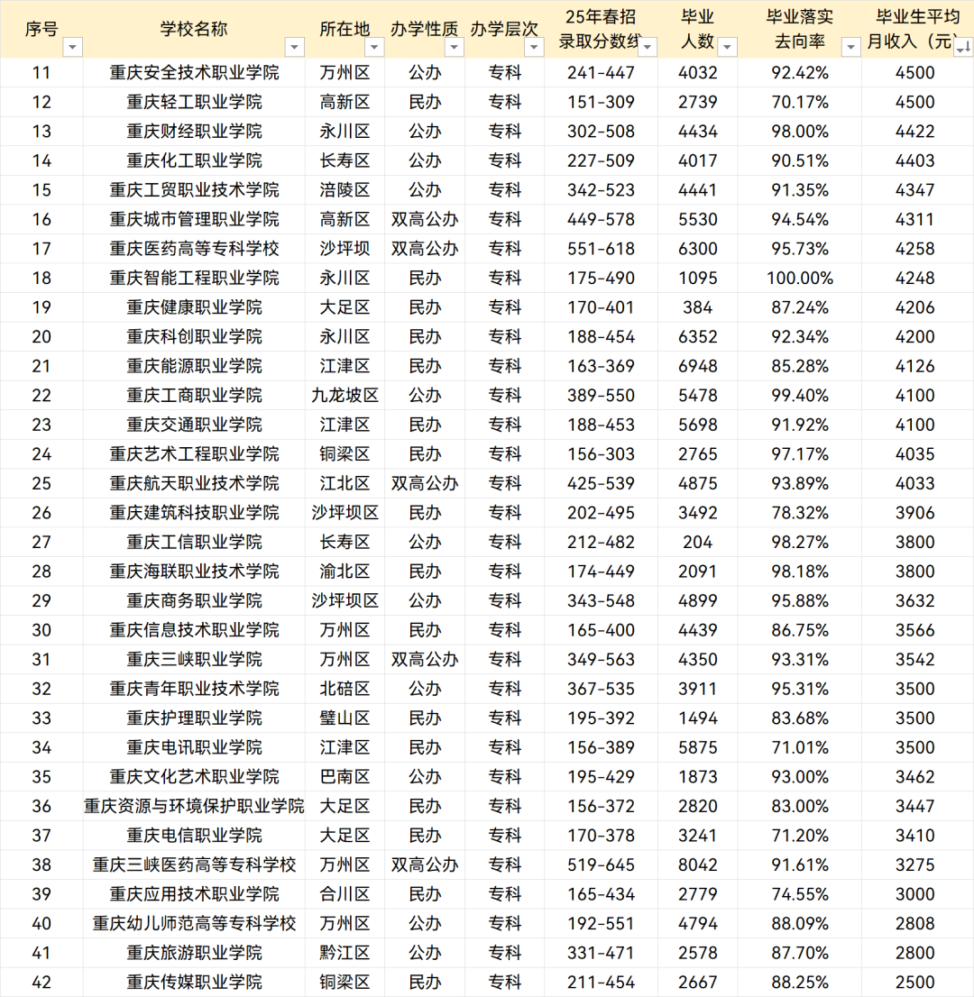 重庆坐拥汽车、电子、装备、医药等全产业链,其中在重庆春招院校对接重庆本地的产业需求,对重庆考生来说,本地院校实训资源丰富,企业合作紧密,就业机会大,毕业生月收入高,选择走春招更加明智。一起来看看毕业生月收入前10所的院校:前10所院校其他院校